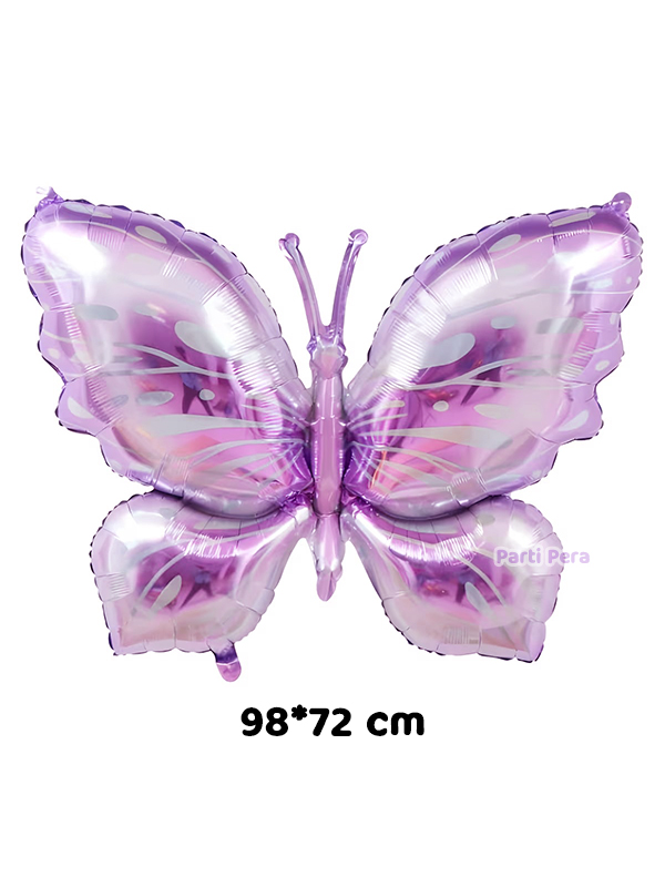 Göz alıcı mor ve gümüş renk kombinasyonuyla dikkat çeken kelebek folyo balon, özel günlerinizi renklendirir.