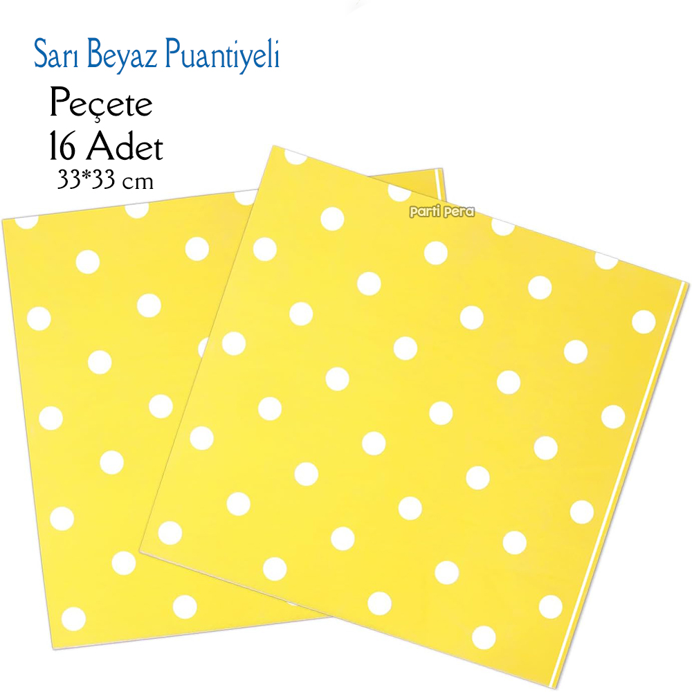 - Sarı Beyaz Puantiyeli Peçete 16 Adet 33*33 cm seçeneği ile masalarınıza şık ve modern bir dokunuş ekler, dekorasyonunuzu tamamlar.