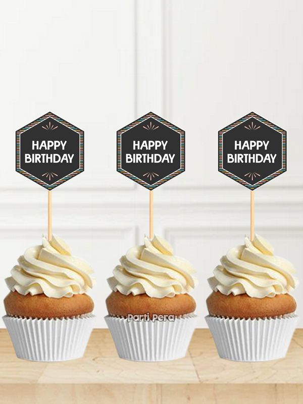- 15 adet Happy Birthday temalı cupcake pasta kürdan süsü, doğum günü kutlamalarınızda şık bir dokunuş sağlar.